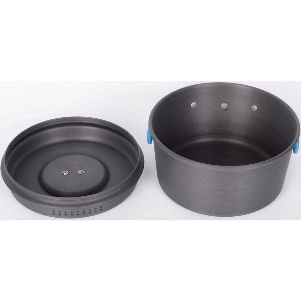 A hard, anodised aluminium pan set which stacks inside itself for easy storage and compact carrying.