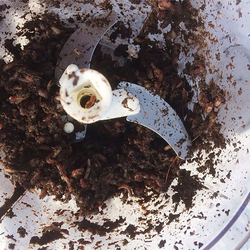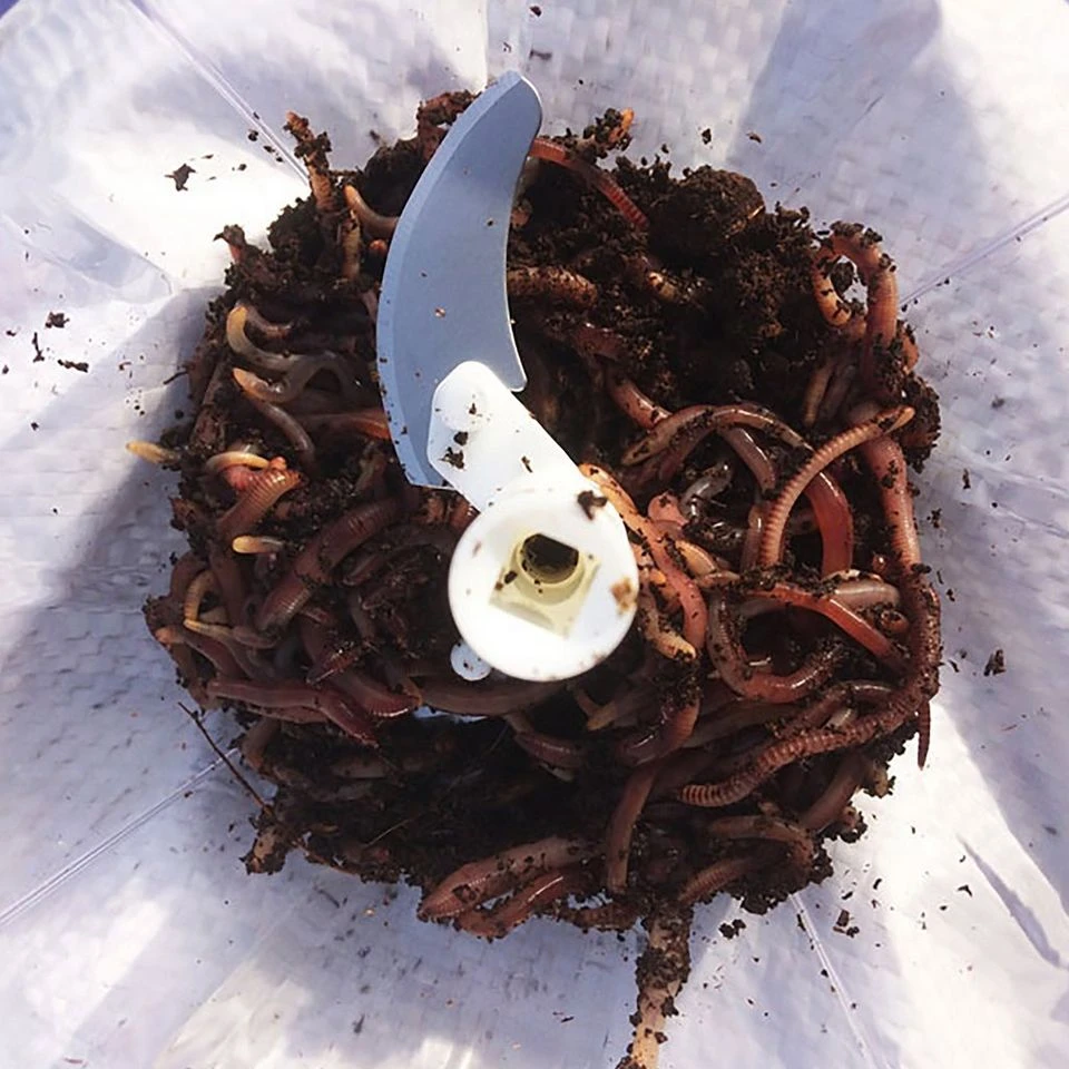 Place your worms in the container around the blades*, secure the lid and pull the rip cord to spin the sharp razors to cut to your desired consistency.